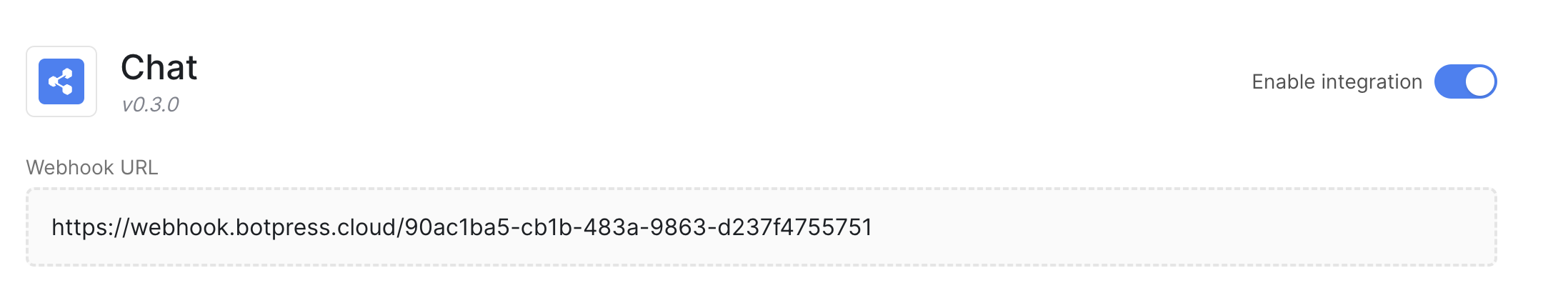 To use this API, make sure the Chat integration is installed to your bot. Then, make sure your integration is enabled and configured.Configuration